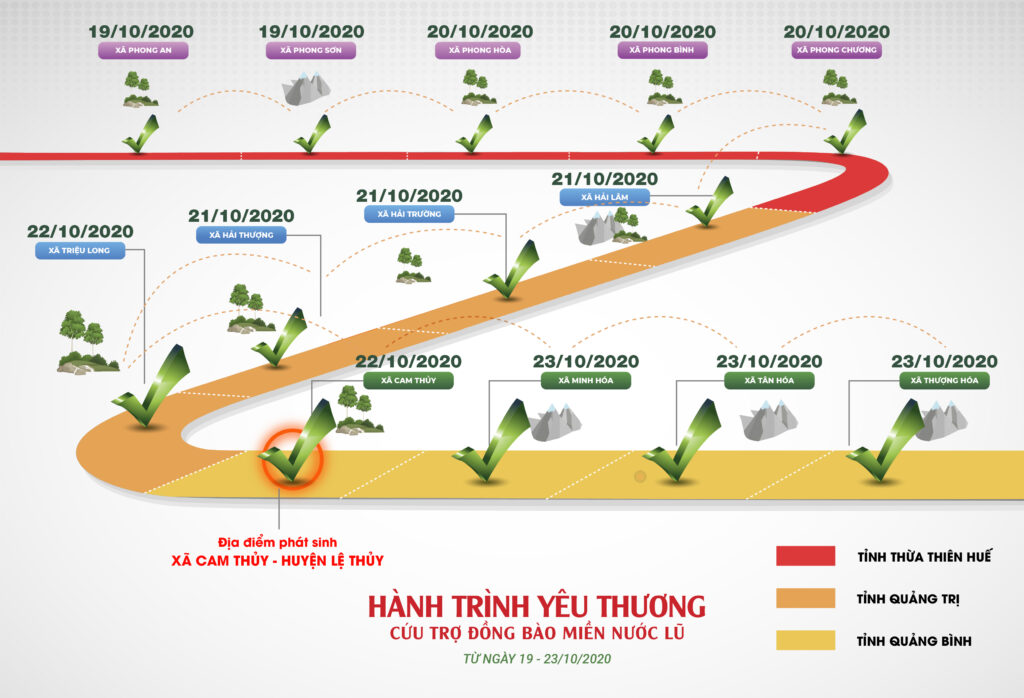 Trong thời gian đi thực tế đến từng vùng, từng địa phương, có nhiều nơi ngập sâu, bị cô lập, lại có những nơi phát tín hiệu kêu cứu khẩn cấp, đoàn đã cố gắng xoay sở lịch trình để có thể cứu trợ kịp thời và tối đa nhất những trường hợp có thể tiếp cận. Bên cạnh 1.300 hộ dân nghèo trong danh sách đã được 12 xã cung cấp trước đó, đoàn đã đến thăm phát và trao tặng những phần quà phát sinh cho thêm nhiều hộ dân, ghé qua huyện Lệ Thuỷ - điểm kêu cứu phát sinh ngoài lịch trình. Số lượng quà tặng tăng hơn dự kiến ban đầu của CLB, cùng với những phần đóng góp và hỗ trợ tăng theo từng giờ, từng ngày của quý Anh Chị, quý nhà hảo tâm và các mạnh thường quân đã luôn dõi theo, đồng hành và ủng hộ cho CLB. Tổng kết số lượng phần quà cứu trợ đã phát trong hành trình là 1.839 phần quà cứu trợ (trong đó các phần quà phát sinh được phát cho các hộ dân nghèo bị cô lập, những hoàn cảnh neo đơn không thể đến điểm tập kết cứu trợ, những mảnh đời bất hạnh khác ở xã Triệu Long: 17 phần, xã Cam Thủy 200 phần, xã Minh Hóa 100 phần, xã Tân Hóa 97 phần, và xã Thượng Hóa 125 phần). Tổng số tiền quyên góp được đến hết ngày 23/10 mà CLB tổng kết được là 590,332,000 VNĐ.