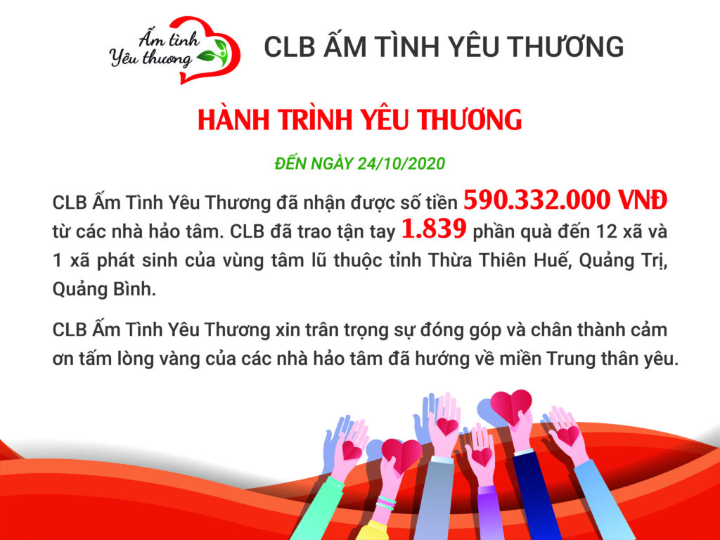 Sau 5 ngày đêm với “Hành Trình Yêu Thương”, đoàn cứu trợ CLB Ấm Tình Yêu Thương đã hoàn thành phát tặng những phần quà cứu trợ cho các hộ dân nghèo tại 12 xã thuộc 3 tỉnh “rốn lũ” là Thừa Thiên Huế, Quảng Trị, Quảng Bình.