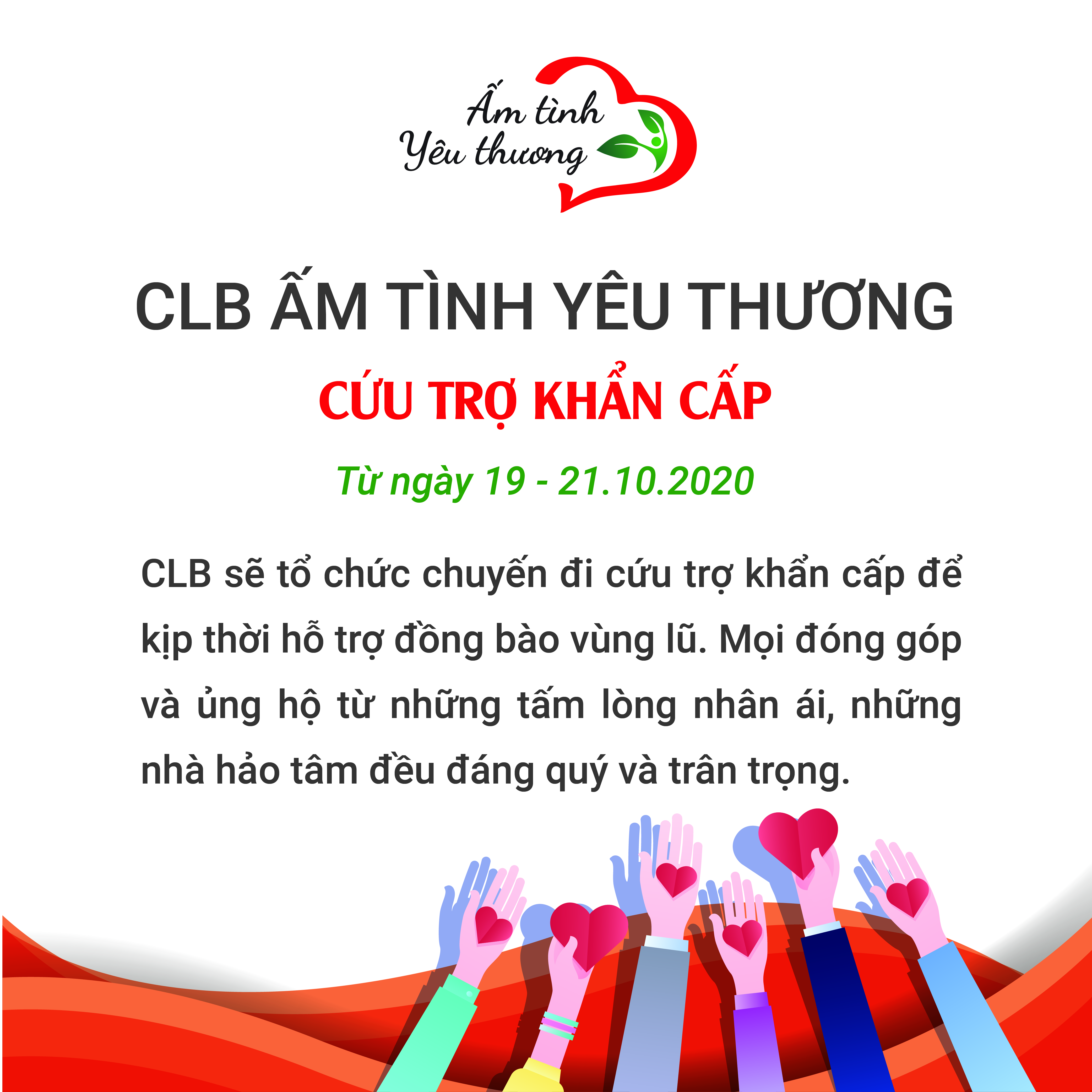 CLB rất mong nhận được sự chung tay vì cộng đồng và mong muốn thông tin này được đến nhiều hơn với nhiều những người hảo tâm hơn nữa. Hãy cùng CLB thiện nguyện Ấm Tình Yêu Thương cứu trợ khẩn cấp – hướng về miền nước lũ.