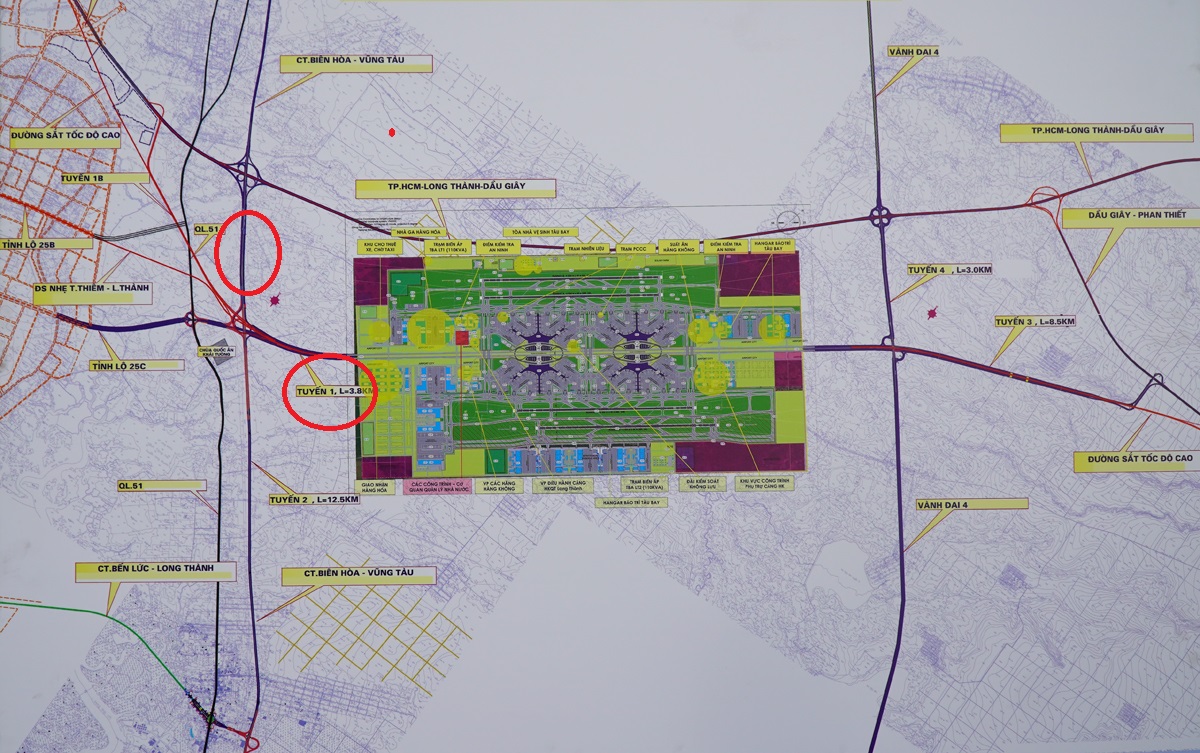 Bản đồ quy hoạch hệ thống giao thông kết nối sân bay Long Thành trong tương lai, trong đó hai tuyến đường kết nối được Đồng Nai đề xuất xây dựng bên trái (vòng tròn đỏ). Ảnh: Phước Tuấn.Để thực hiện hai tuyến đường, Đồng Nai sẽ thu hồi đất, đền bù, hỗ trợ, tái định cư đối với diện tích khoảng 136 ha. Hiện địa phương đã chủ động cắm mốc ranh giới, đưa vào kế hoạch sử dụng đất đối với hai tuyến đường này.