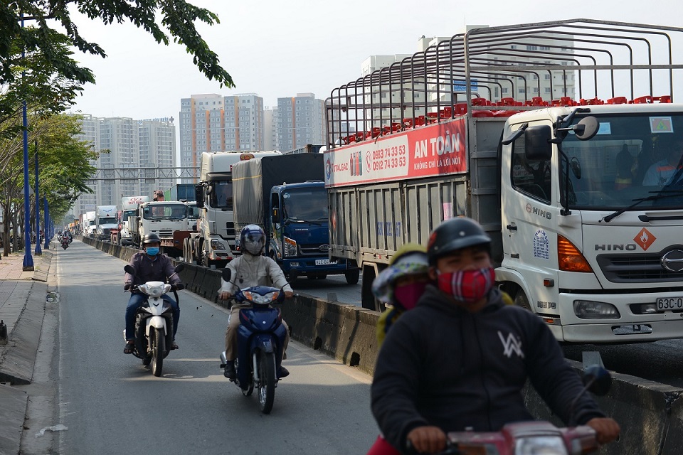 Dòng xe tải kẹt cứng trên đường Đồng Văn Cống vào cảng biển Cát Lái.