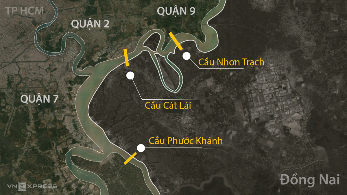Dự án 3 cầu: Nhơn Trạch, Cát Lái, Phước Khánh nối Đồng Nai với TP HCM. Đồ họa: Khánh Hoàng.Ngoài Bình Dương và TP HCM, để kết nối với đường liên cảng chạy dọc sông Thị Vải và Đồng Nai, UBND Đồng Nai và Bà Rịa - Vũng Tàu cũng thống nhất xây dựng cầu Phước An với tổng kinh phí gần 5.000 tỷ đồng. Cầu dài 3,4 km, có quy mô 6 làn xe, cách cảng Phước An 150 m về phía thượng nguồn.